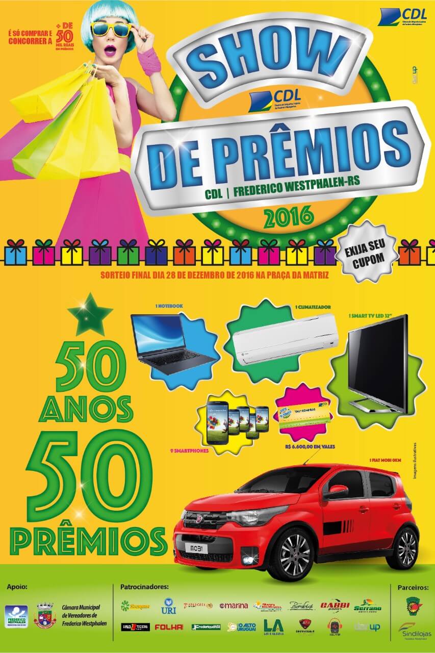 Em 2016, na comemoração de 50 anos da CDL-FW, a Show de Prêmios sorteou dezenas de premiações fantásticas que fizeram um marco nesta data especial. Cerca de 250 mil cupons, de 85 empresas, participaram da campanha. Na 15ª edição da Campanha Show de Prêmios, a CDL-FW e seus apoiadores presentearam Frederico Westphalen e região com os seguintes prêmios: Um carro 0km, um notebook, uma smart TV, 9 smartphones, 01 climatizador e 37 vale-compras.