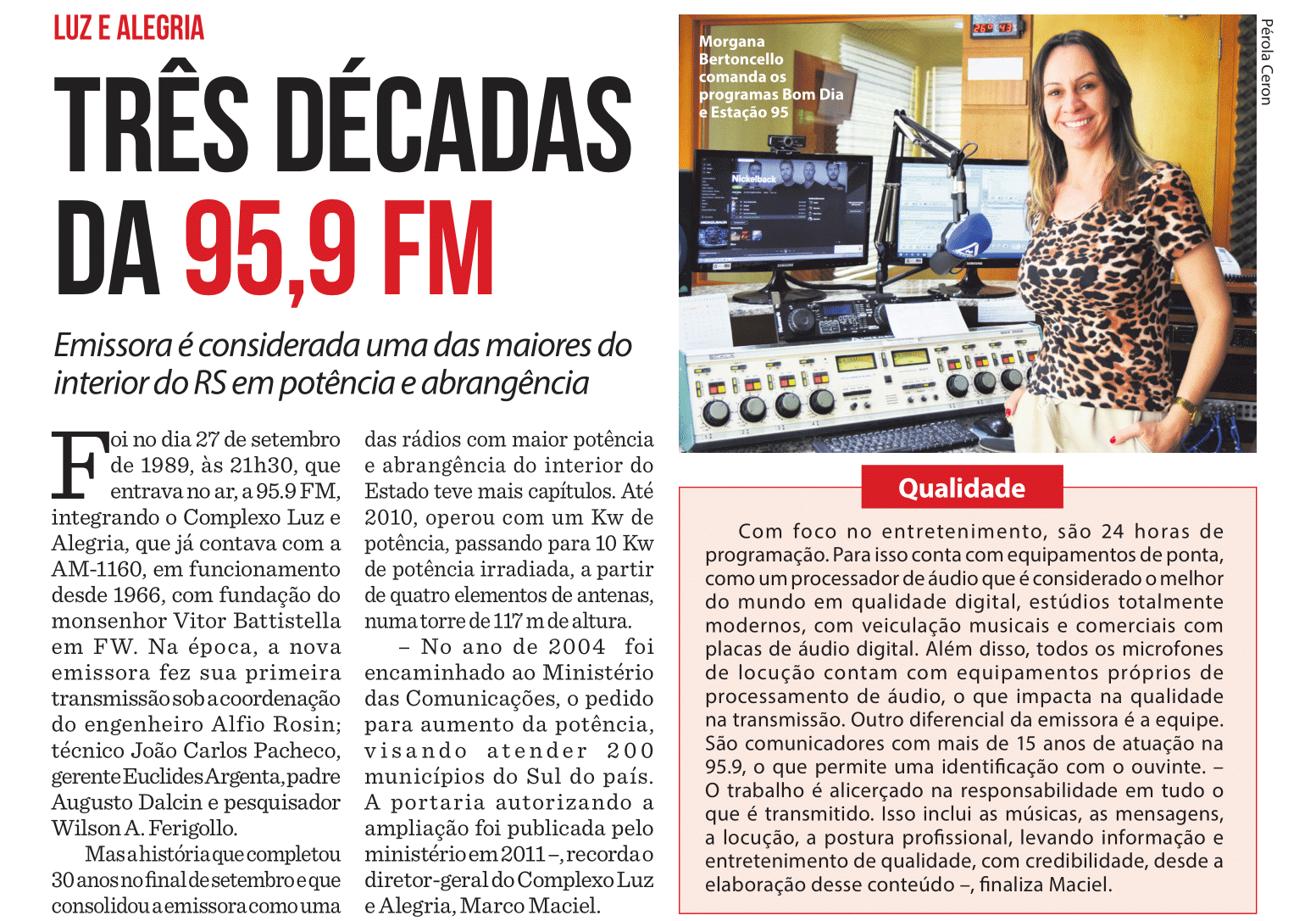 A Rádio FM 95.9, que integra o Complexo Luz e Alegria, celebra os 30 anos de inauguração do veículo e de muita história para contar. A longa trajetória é marcada por conteúdos de qualidade, notícias em tempo real, entretenimento e ética profissional, que juntos consagraram a liderança regional da FM 95.9. A CDL-FW parabeniza o diretor da unidade, Marco André Maciel, e todos os seus colaboradores, pela dedicação diária em nome da satisfação de cada ouvinte. Quer anunciar na rádio, pedir uma música ou entrar em contato com a equipe? Ligue para o número (55) 3744-3500.