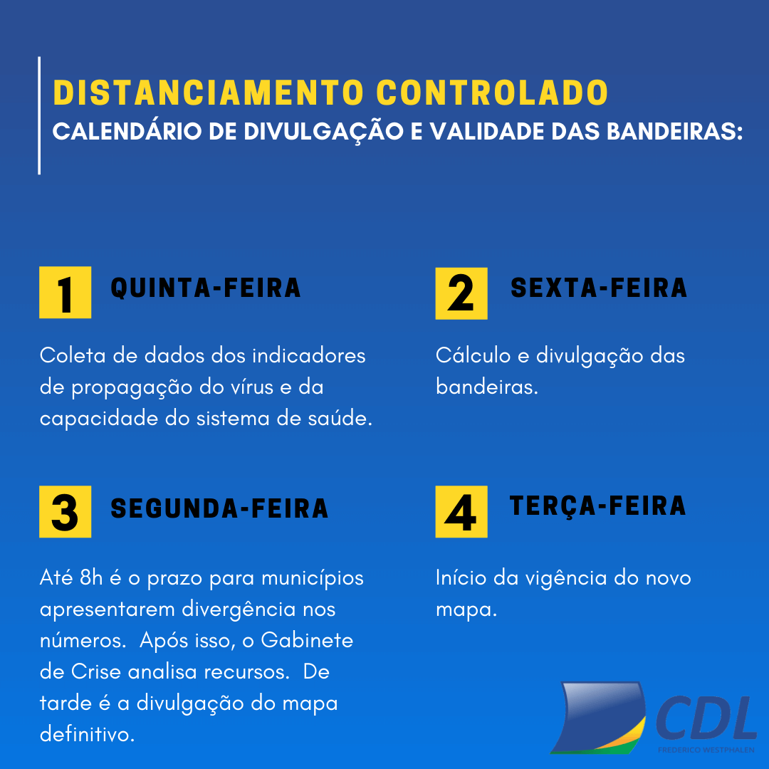 Por conta da pandemia do novo coronavírus, o estado do Rio Grande do Sul está sendo monitorado a partir do plano de distanciamento controlado desenvolvido pelo governo do RS. Tendo o objetivo de controlar a disseminação da Covid-19 e manter a economia ativa de acordo com a capacidade do sistema de saúde e a propagação do vírus nas diversas regiões do estado. Para esse controle ser mais eficaz foi definido que após a divulgação preliminar do mapa com a bandeira de risco para cada região, os municípios podem contestar o resultado e reivindicar mudanças. Confira o calendário de divulgação e validade das bandeiras:
