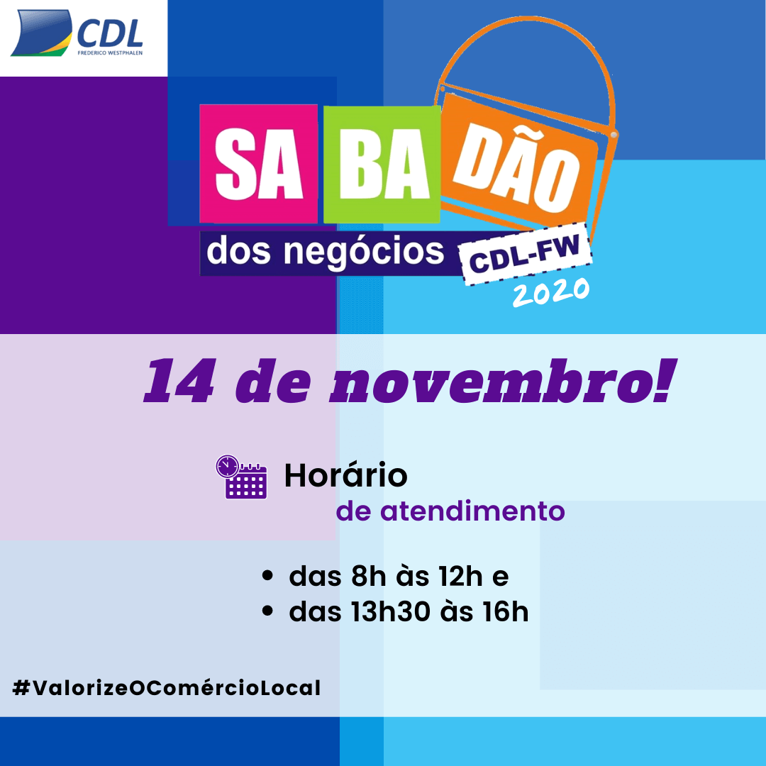 Para iniciar com a movimentação de vendas para o final de ano, a Câmara de Dirigentes Lojistas de Frederico Westphalen (CDL-FW) promoverá neste sábado, 14, o Sabadão dos Negócios. O horário ampliado de atendimento será das 8h às 12h e das 13h30min às 16h, para dessa forma satisfazer as demandas de todos os clientes. Outra vantagem é que ao comprar com os associados da CDL-FW e ACIFW participantes da campanha Show de Prêmios, o consumidor poderá receber cupons e concorrer a um carro zero km e 10 mil em vale-compras.