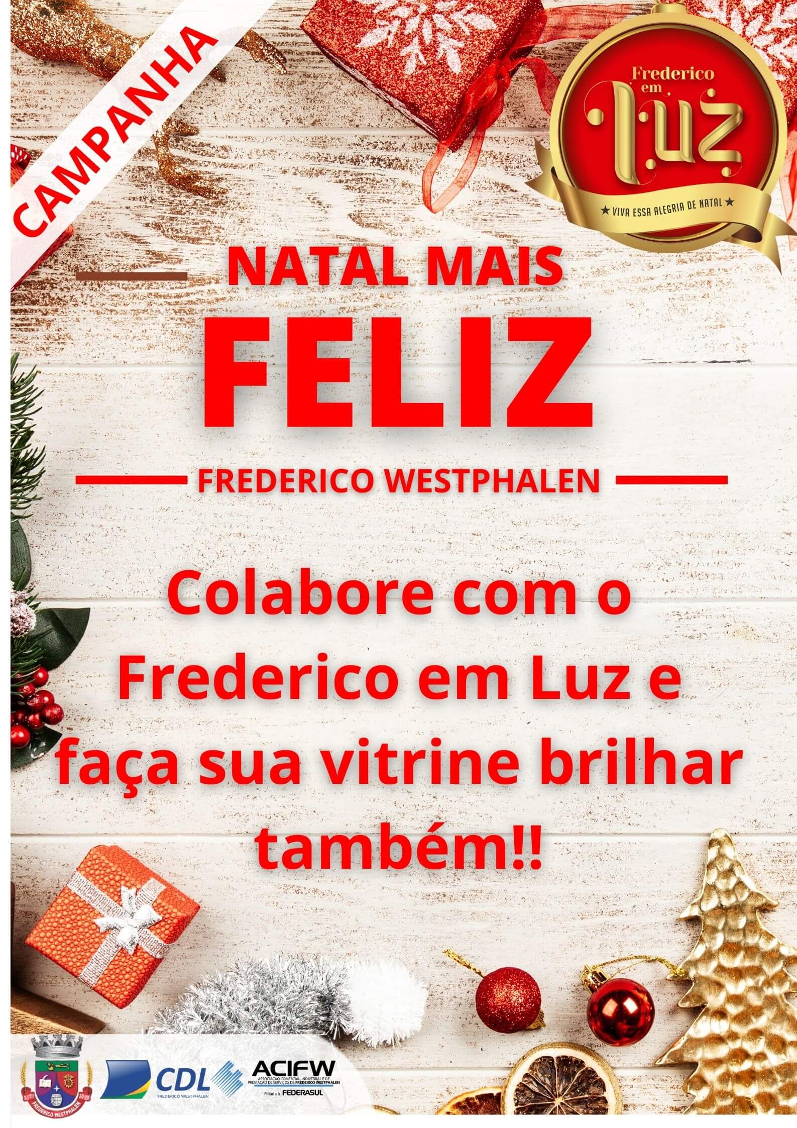 Pensando em um ambiente comercial mais acolhedor para as festividades de final de ano, a Câmara de Dirigentes Lojistas de Frederico Westphalen (CDL-FW) juntamente com a Associação Comercial, Industrial e de Prestação de Serviço de Frederico Westphalen (ACIFW) e Administração Municipal desenvolvem entre os dias 11 e 23 de dezembro a campanha “Natal mais Feliz”, que tem por objetivo incentivar os lojistas associados do município a embelezar as vitrines de suas lojas. Com essa campanha, a cidade entrará ainda mais no clima natalino deixando a magia dessa época do ano ainda mais presente.