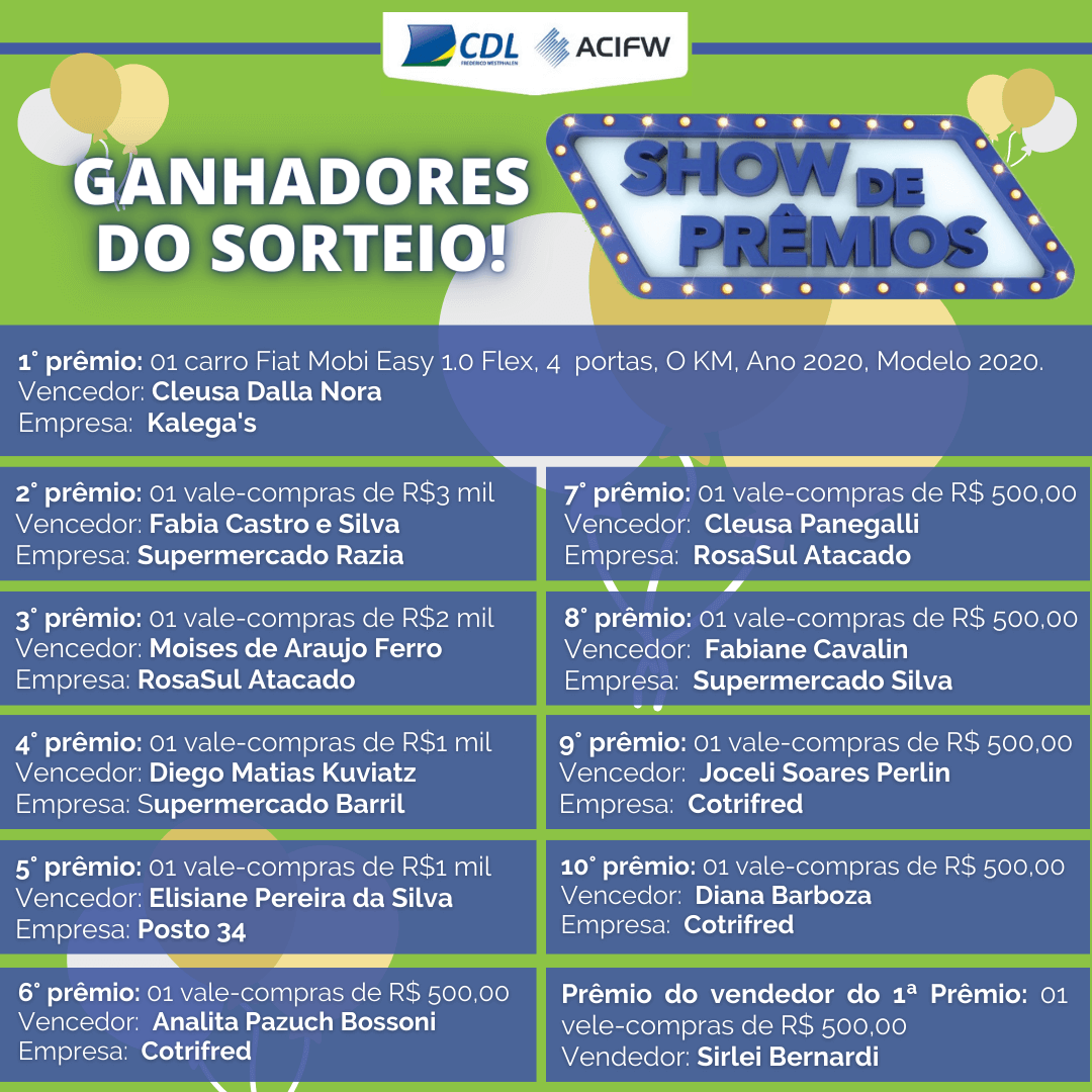As entidades destacam que os prêmios terão um prazo de 30 dias para serem retirados junto à CDL-FW com pré-agendamento de horário e data.