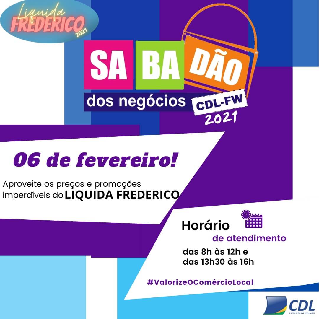 O primeiro Sabadão dos Negócios do ano de 2021, será realizado no dia 06 de fevereiro. A ação será desenvolvida para dar fechamento ao Liquida Frederico que ocorre do dia 01 de fevereiro, até o dia 06. Com a realização do Sabadão, o comércio ficará aberto das 8h às 12hr e das 13h30 até às 16h. A CDL-FW salienta a importância do distanciamento social e a necessidade de respeitar todos os protocolos de segurança, definidos pelas autoridades, referentes ao Covid-19.