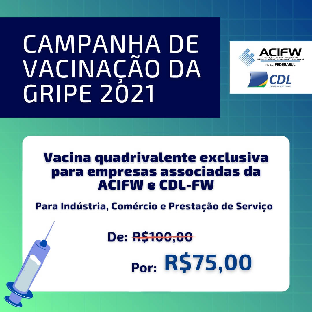 Assim como em outros anos, a Associação Comercial, Industrial e de Prestação de Serviço de Frederico Westphalen (ACIFW) realizará a Campanha de Vacinação contra gripe exclusivamente para as empresas associadas da entidade e também da CDL-FW. A vacina quadrivalente (AH1N1 + AH3N2 + B + B), que protege contra quatro tipos de vírus da gripe, será disponibilizada aos colaboradores das empresas e seus dependentes, através da parceria com o SESI/RS.