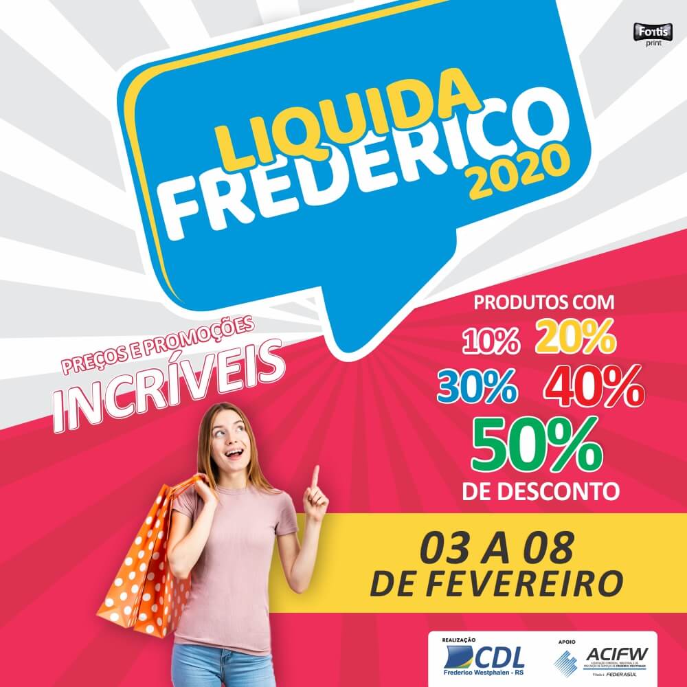 O Liquida Frederico está de volta ao comércio em mais uma campanha promovida pela Câmara de Dirigentes Lojistas de Frederico Westphalen (CDL-FW). A ação ocorrerá entre os dias 3 a 8 de fevereiro, viabilizando uma semana repleta de preços, prazos e condições especiais em todo o comércio local. A proposta movimenta o setor comercial do município e atinge empresas associadas da CDL-FW e da Associação Comercial, Industrial e de Prestação de Serviços de Frederico Westphalen (ACIFW). Os produtos poderão alcançar até 50% de desconto, oportunizando promoções incríveis aos clientes e a queima de estoque a lojistas. De acordo com o presidente da CDL-FW, Yuri Vendruscolo de Souza, este tipo de ação é aguardada por clientes que asseguram no período mercadorias contendo valores mais acessíveis, enquanto os comerciantes são beneficiados por terem a oportunidade de liquidar produtos com poucas unidades, numeração quebrada ou até mesmo de coleções passadas. “Nós sugerimos aos lojistas que possuem produtos de ponta de estoque, que tenham restado apenas um modelo ou tamanho, por exemplo, que realizem esses descontos”, orienta o presidente da entidade. As empresas que aderirem às ofertas estarão identificadas com a arte da campanha em seus empreendimentos ou/e nas redes sociais.